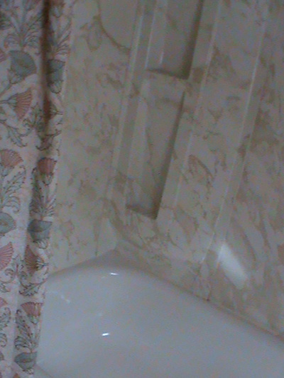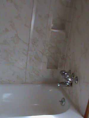 The rear of the bathtub,with a picture of the second of the two soap shelves built-in.