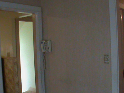 Telephone on the wall, with a dimmer switch for the lighting on the same wall.